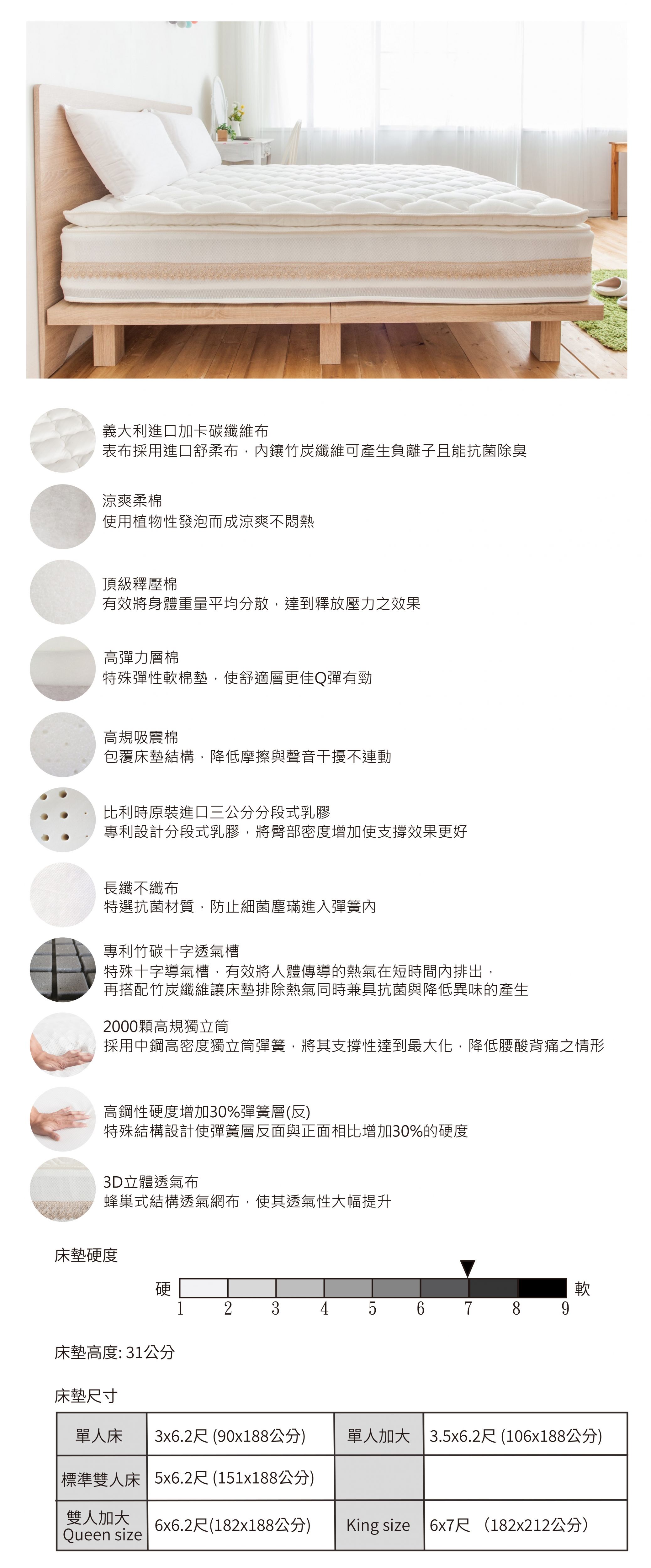 表布使用高機能性的竹炭纖維布能讓床墊抗菌除臭,在加上Q彈的乳膠使舒適層有好幾種層次,且針對腰部、頸肩較為敏感採用2000顆高密度獨立筒彈簧,讓床墊結構性與支撐性更強,睡起來雖然柔軟但身體的壓力利用高密度彈簧平均分擔,更重要的是床墊結構體可更換軟硬,是張柔軟卻有好多支撐性的好好睡床墊。